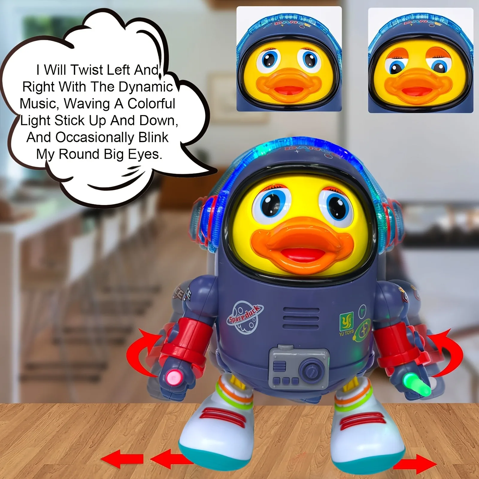 The duck's eyes blink in rhythm with the music, adding an interactive and dynamic aspect to the toy.